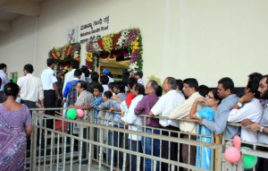 Commuters queue in front of Namma Metro station on M G Road after the inauguration of Namma Metro in Bangalore on Thursday. KPN