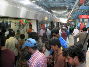 Commuters board the Namma Metro train at M G road station after the the inauguration of Namma Metro, in Bangalore on Thursday. KPN